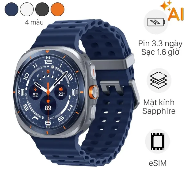 Galaxy Watch Ultra, ra mắt tháng 7/2024, gây ấn tượng mạnh với thiết kế lai độc đáo, kết hợp mặt tròn truyền thống và khung viền vuông hầm hố, cùng vật liệu Titanium cao cấp và kính Sapphire. Được trang bị chip Exynos W1000 thế hệ mới, chiếc đồng hồ này mang đến hiệu năng vượt trội, theo dõi sức khỏe chuyên sâu với AI, và đạt chuẩn độ bền MIL-STD-810H, là lựa chọn lý tưởng cho người yêu thể thao và phiêu lưu. Thời lượng pin ấn tượng lên tới 80 giờ (tắt AOD) là một điểm cộng lớn.