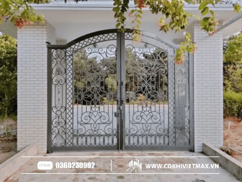 • Cổng sắt vòm chạm khắc: Kiểu dáng vòm mang hơi hướng kiến trúc châu Âu, Địa Trung Hải, thường đi kèm các họa tiết chạm khắc tinh tế, rất phù hợp với biệt thự sân vườn hoặc những ngôi nhà có phong cách lãng mạn.