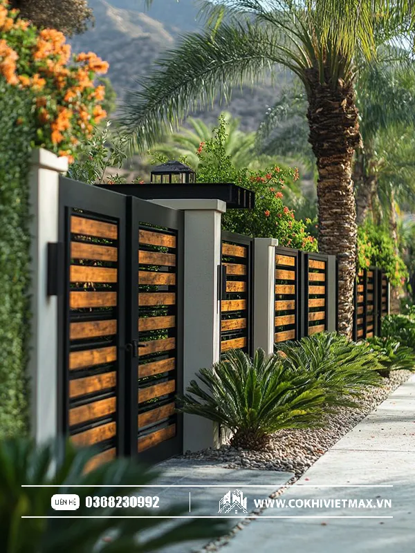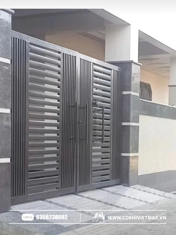 • Cổng sắt hộp vuông, sọc ngang: Phong cách tối giản, hiện đại, tạo cảm giác mạnh mẽ và sạch sẽ, rất phù hợp với nhà phố hiện đại hoặc biệt thự kiến trúc đương đại.