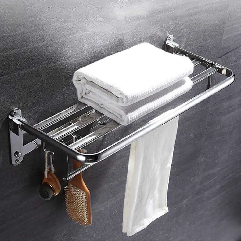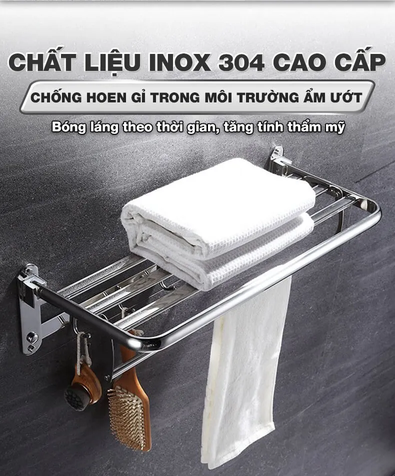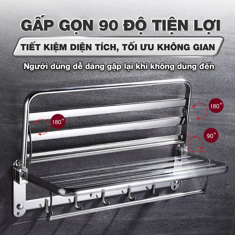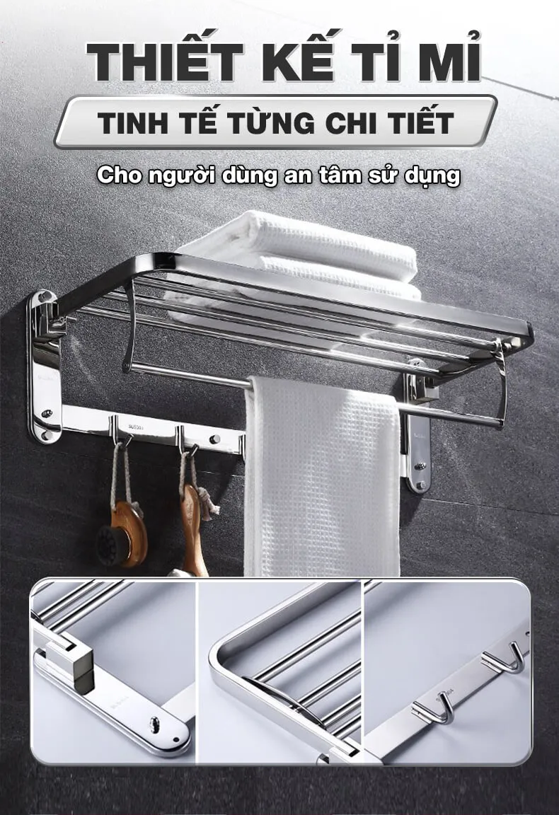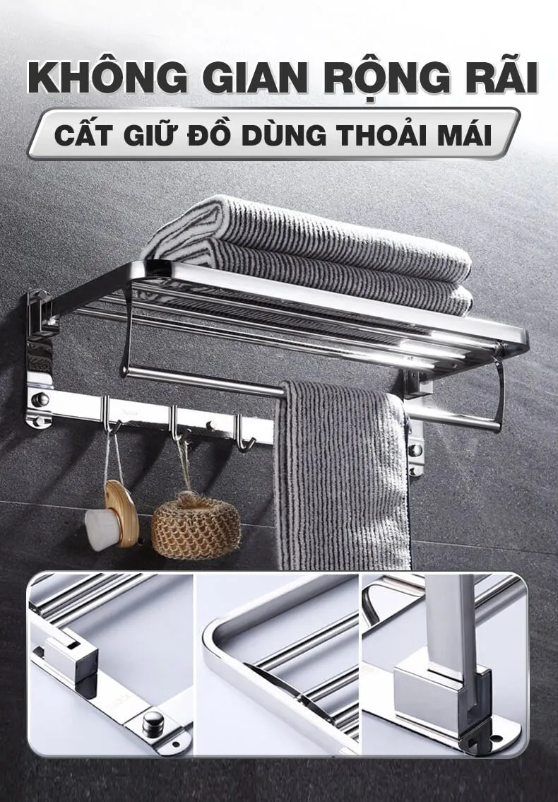 Không chỉ dừng lại ở việc treo khăn, giá treo khăn nhà tắm inox 304 thế hệ 2026 còn được thiết kế như một hệ thống lưu trữ đa năng. Phần kệ phía trên có thể để khăn xếp khô, trong khi các thanh treo phía dưới dành cho khăn đang sử dụng. Thậm chí, các móc treo nhỏ tích hợp ở chân giá còn cho phép treo bông tắm, bàn chải hoặc các phụ kiện nhỏ khác.