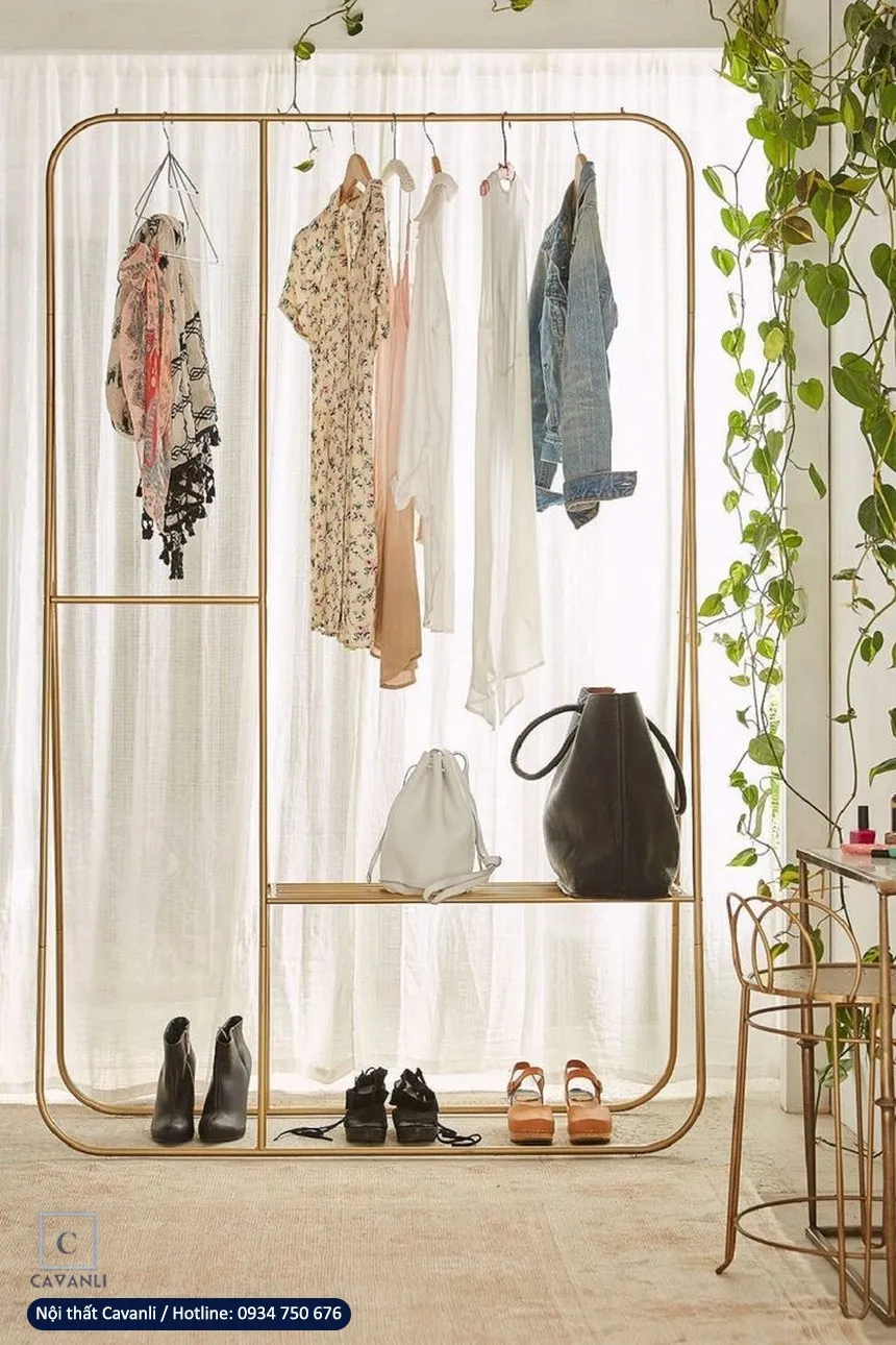 Mẫu kệ treo quần áo bằng sắt sơn vàng mang lại vẻ sang trọng cho không gian.