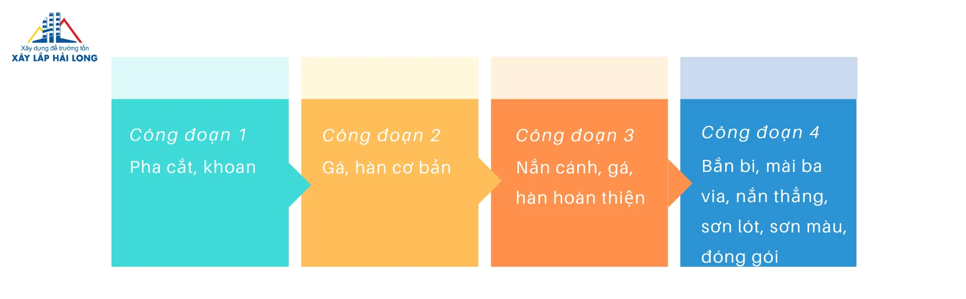 - Gá, Hàn Cơ Bản: Công đoạn này tạo hình cơ bản cho cấu kiện bằng các phương pháp gông, ráp nối và hàn đính. Sau đó, các bộ phận bán thành phẩm được hàn tự động hoặc bán tự động.