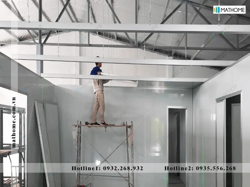 Bước 5: Hoàn thiện. Lắp đặt hệ thống điện, đèn, ổ cắm. Lắp cửa, cửa sổ. Xử lý mối nối, sơn hoặc trang trí bề mặt theo yêu cầu. Lắp sàn gỗ hoặc sàn nhựa nếu cần.