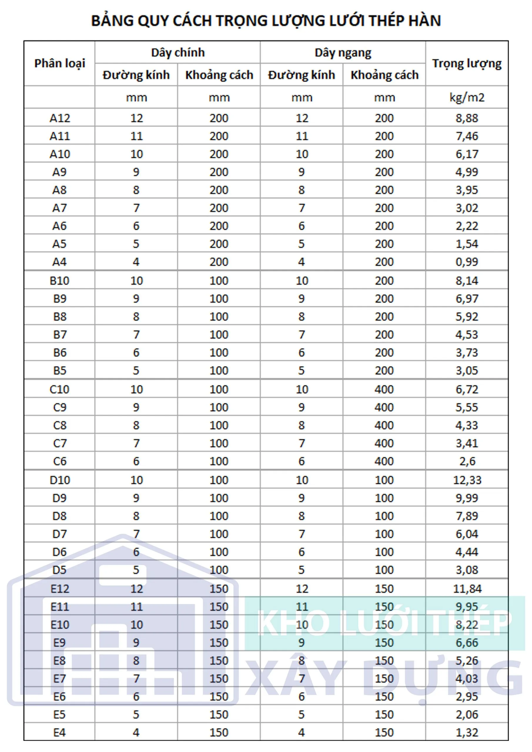 `Bảng quy cách và trọng lượng tiêu chuẩn của lưới thép hàn – lưới đổ sàn bê tông`