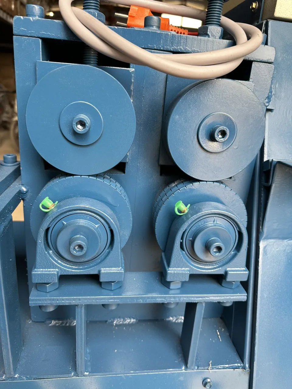 Để có thể bẻ đai chính xác, thanh thép trước tiên cần được duỗi thẳng hoàn toàn và được kéo vào máy với tốc độ ổn định. Bộ phận này bao gồm hệ thống con lăn và bánh răng kéo, thường được làm từ thép C50 đã qua tôi luyện hoặc vật liệu SKD chống mài mòn cao, tùy thuộc vào yêu cầu kỹ thuật và ngân sách của khách hàng. Vật liệu của các bánh kéo này được gia công và xử lý nhiệt chân không cao tầng để tăng cường khả năng chống mài mòn, đảm bảo lực kéo bám vững chắc vào thanh thép và giữ cho thanh thép luôn thẳng trong suốt quá trình di chuyển. Quá trình này cực kỳ quan trọng để đảm bảo đầu vào cho bộ phận bẻ luôn ở trạng thái lý tưởng, giúp máy bẻ đai thép tự động hoạt động hiệu quả.