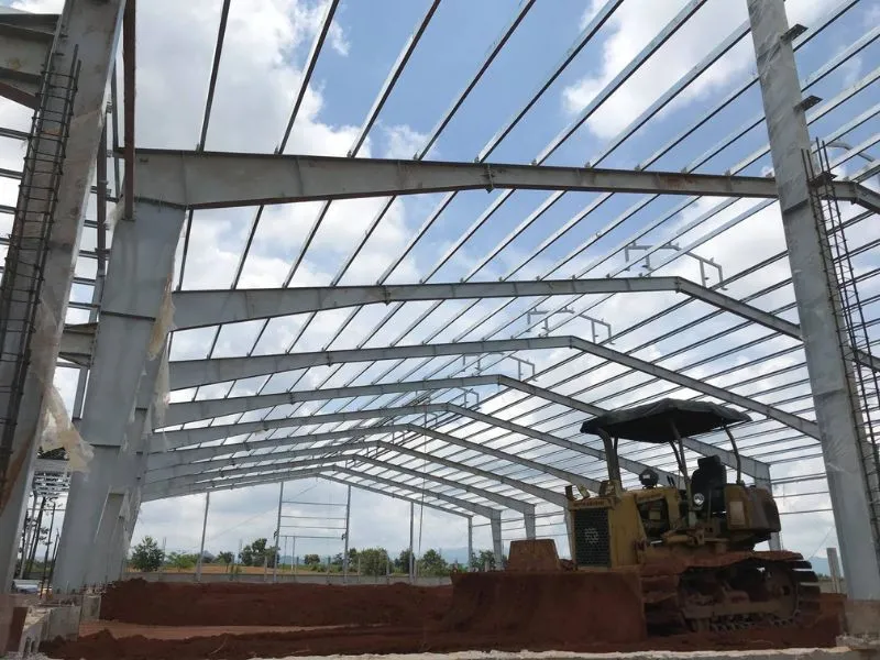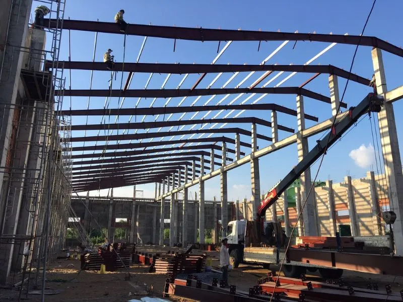 Khung và mái (4-6 tuần): Lắp dựng khung thép hoặc đổ bê tông cột dầm, lợp mái tôn, lắp ô lấy sáng. Kiểm tra độ vuông góc và độ thẳng đứng của cột.