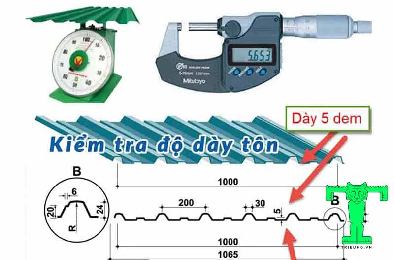 Độ dày tôn lợp mái thực tế đo bằng thiết bị chuyên dụngChú thích: Các chuyên gia kỹ thuật thực hiện đo đạc thực tế để xác định tôn lợp mái dày bao nhiêu trước khi lắp đặt.