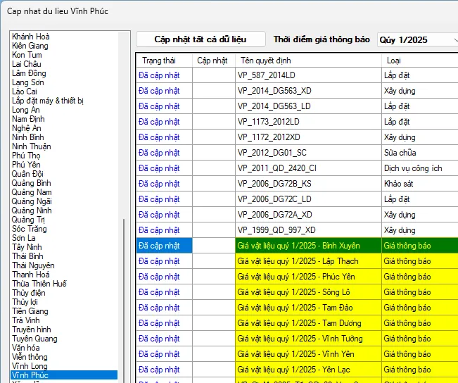 Giao diện cập nhật dữ liệu giá vật liệu Vĩnh Phúc trên phần mềm Dự toán F1
